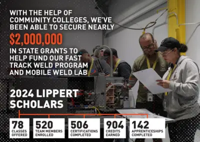The Lippert Scholars Program, which includes full scholarships, hands-on experience, and industry-recognized certifications is one of the ways we help support the trades. In partnership with local trade and tech schools, our program offers a fast-track to high-wage careers in advanced manufacturing, without student debt.
